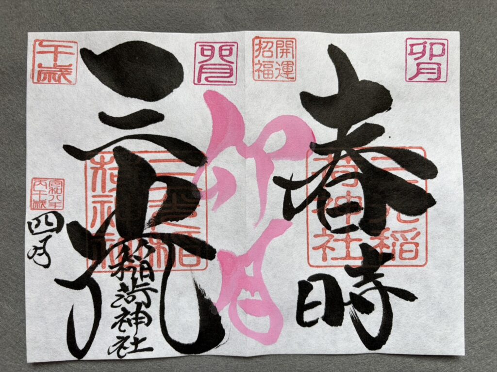 卯月『春時』見開き御朱印の奉筆は、『春時』・卯月・三光稲荷神社・四月とさせていただきます。